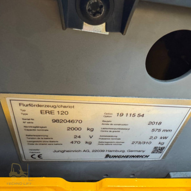 Пропонуємо до продажу високоякісний електричний візок JUNGHEINRICH ERE 120 із серійним номером 98204670. Модель 2018 року випуску відзначається надійністю, стабільною роботою та спеціально розроблена для інтенсивного щоденного використання.
